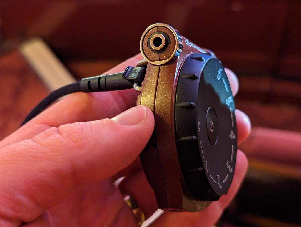 Once reaching our seats (dress circle, C27-28), I quickly set up my headphones and plugged them in. There was some pre-show music which was fairly quietly streamed to the receiver from the beginning, and I had to turn the receiver on when getting to my seat. It’s also a good idea with this model to check the “balance” dial on the back, to make sure the left/right audio balance is to your taste.